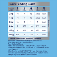 Food requirements vary depending on a number of factors including your pups' breed, sex, age and activity level. The Advance feed guide tables on the back of each Advance packet are provided as a guide only and actual feeding amounts should be based on your puppy's body condition, weight and level of activity. Always ensure that an adequate supply of clean, fresh water is readily available.
