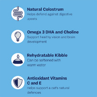 Choline and DHA help to ensure that your kitten’s brain develops to be strong and healthy. Carotenoids, taurine, beta carotene end vitamins help to bolster your kitty’s immune system for a strong natural defence against disease. A healthy coat and skin is also promoted thanks to the inclusion of linoleic acid and zinc.
