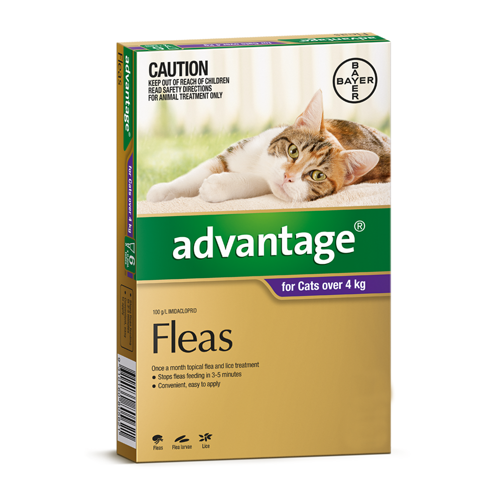 This is a 6 month supply (6 Pack) of Advantage for cats over 4 kgs flea control treatment. This 6 pack of Advantage for cat over 4 kg comes in a purple packet. Each vial kills fleas, kills flea larvae and controls lice for 1 month. Advantage can be used on kittens of any age.