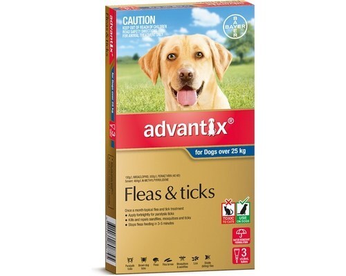 This is a 3 month supply of Advantix for Dogs over 25 kgs Flea & Tick Control Treatment. This 3 Pack of Advantix for Dogs over 25 kgs Flea & Tick Control Treatment comes in a Blue pack. Advantix treats your dog for Adult Fleas, Flea Eggs, Flea Larvae, Paralysis Ticks, Bush Ticks, Brown Ticks, Mosquitoes, Sandflies, Lice and Biting Flies. We make it easy to buy Advantix for Dogs over 25 kgs Flea & Tick Control Treatment at a cheap price.