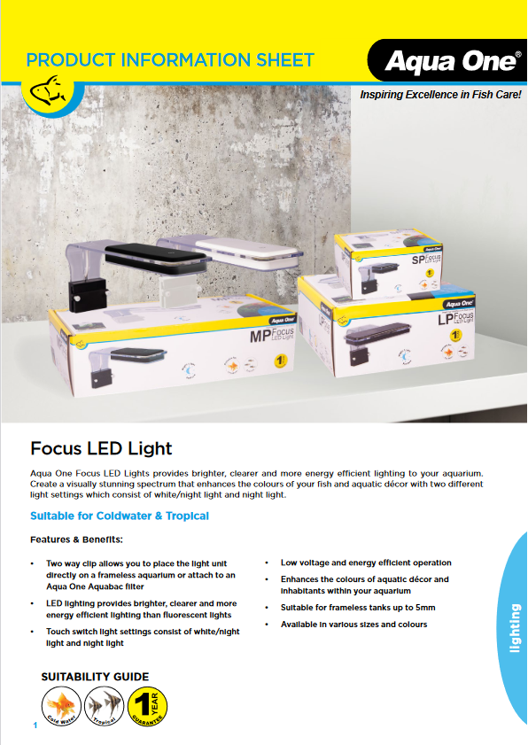 This is a 8.5 Watt Black LP Aqua Focus LED Aquarium Reflector Light by Aqua One. It will easily clip into the side of your frameless aquarium that has glass up to 5mm. It has two setting to switch between being white/night light or night light. These LED lights are low voltage and are very energy efficient. It will help to enhance the colour of your fish and decor in your aquarium.