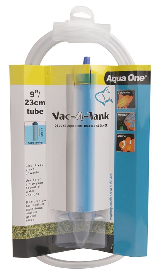 The 23cm Aqua One Vac-A-Tank Aquarium Gravel Cleaner makes maintain a healthy aquarium easy. This cleaner will remove waste material from gravel while leaving the gravel in place. This reduces the build-up of harmful chemicals such as ammonia and nitrate so your fish are kept healthy and happy. Aqua One Vac A Tank Gravel Cleaner us designed for easy use. With less mess, less effort, you will love this time saving aquarium accessory.