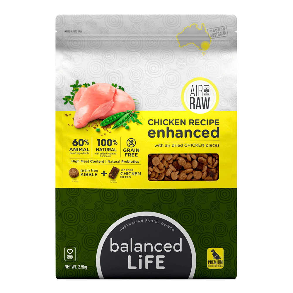 Balanced Life Enhanced Chicken is and Australian first mix of air dried raw meat and kibble! This premium meal is perfect for those wanting to add the benefits of raw food without upsetting their pets current diet. Being 100% Aussie made, this grain free kibble is made from sustainably sourced Chicken and a mix of super foods including coconut and kelp, blended with pieces of air-dried chicken meat. This low fat high protein diet is suitable for dogs and puppies of all breeds and life stages!