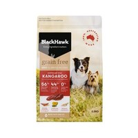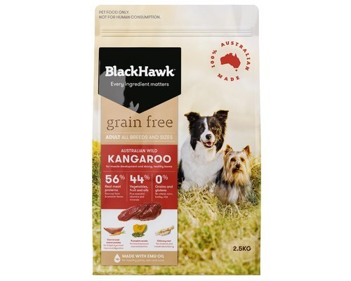 This is a 2.5kg bag of Black Hawk Grain Free Adult Kangaroo Dog Food. Black Hawk Professional Dog Food is made with special ingredients to ensure your dog stays healthy throughout their life. Black Hawk premium pet food is 100% Australian made.
