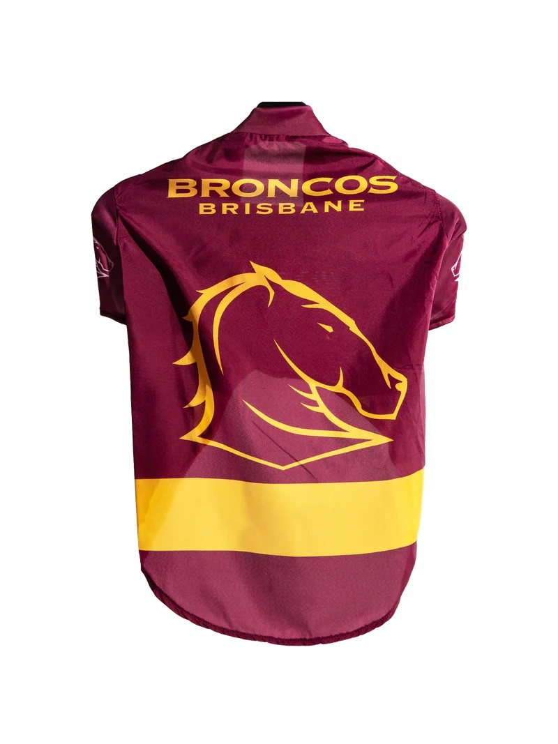 This is a Medium Brisbane Broncos NRL Dog Jersey. It is officially licensed by the NRL. This jersey is made from a light weight and breathable material, suitable to be worn all year round. Become the ultimate supporter for your team and have your pet match you with this Brisbane Broncos Dog Jersey. This dog shirt/jersey comes in 5 sizes.