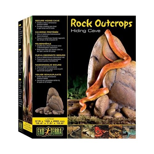 The an Exo Terra Rock Outcrops Hiding Cave help create a more 3-dimensional habitat in all types of terrariums. The shape of these Rock Outcrops enables them to fit nicely in small spaces, minimizing wasted space within the terrarium and generating basking areas closer to the top screen. The multiple entrance holes turn this Rock Outcrop into a secure hiding space, preventing stress.
