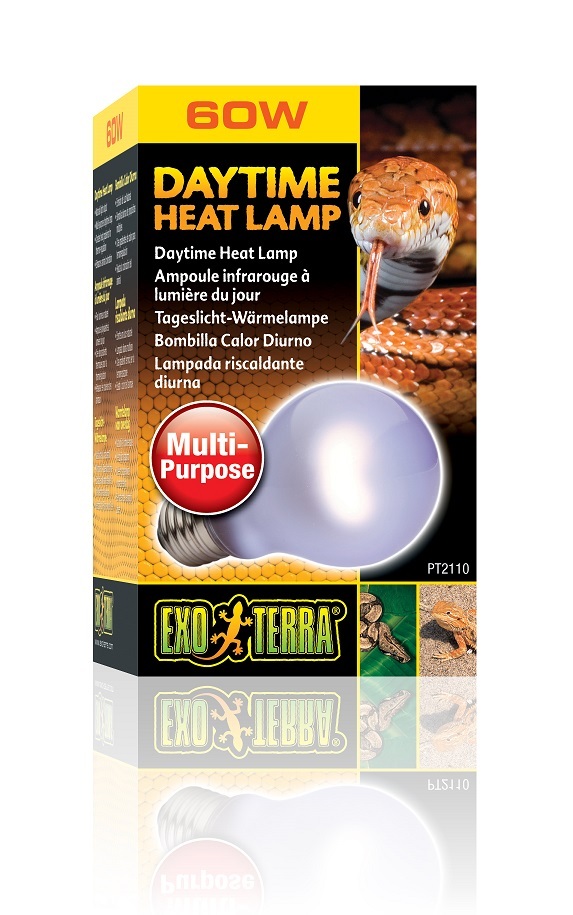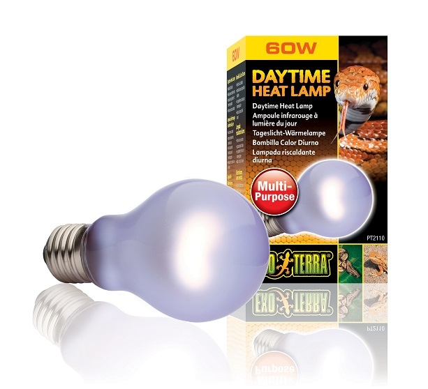 The 60 Watt Daytime Heat Lamp for reptiles is a broad spectrum daylight lamp for terrariums. It stimulates reptile breeding behaviour through UVA rays. This heat lamp increases ambient air temperature in your pet's habitat. Use with a night heat lamp or infrared basking lamp for a natural 24 hours cycle.