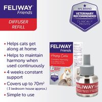 The Feliway Friends Refill will fit into the Feliway Friends Diffuser to help to reduce conflict in your household with kittens and cats. It is to stop tension with cats living together, and avoid signs like fighting, chasing, blocking, staring. The area that the Feliway Diffuser will cover is 50 to 70 square meters. One refill will last approximately four weeks.