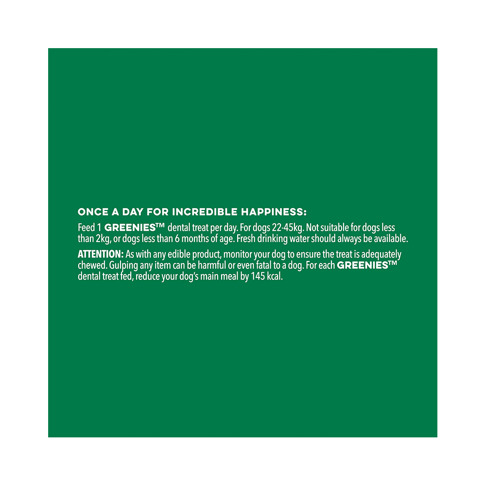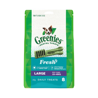340g pack of Large Freshmint Greenies Dog Treats will help clean your dogs teeth and leave their breath mintie fresh. Large Greenies come with 8 treats in each packet.