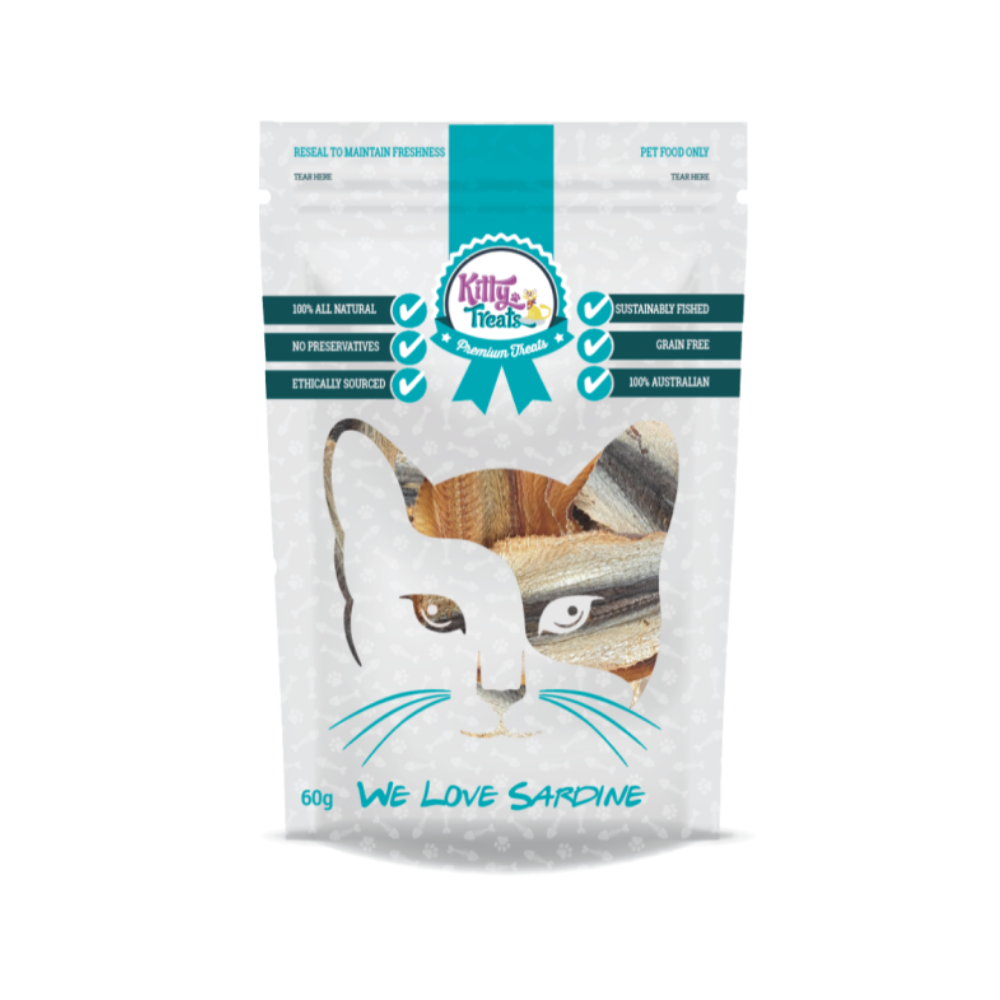 This is a 60g pack of Sardine cat treats by Kitty Treats. These dried whole sardines are a high-protein, grain-free treat that supports your cat's skin, coat, and dental health. Perfect as a standalone treat or meal topper.