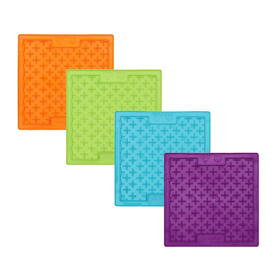 I purchased the blue LickiMat Buddy Pet Feeding Mat for my greedy pug, who eats at 100 bites a second... well that's what it seems like! She was a little nonplussed the first time she saw the new 'dish', but it only took a moment before she got stuck into her food. She still gobbles her food, but it does take her a bit longer now... perhaps it's 50 bites a second! Just the same, I consider it a product worth buying.
