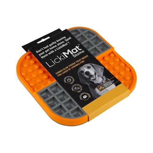 This is an orange Slomo LickiMat. LickiMat has brought out the perfect slow feeder mat for your pet! The slomo is a square shaped lickimat with all sorts of grooves and unique shapes that stimulate the tongue and saliva glands. This increases oral health and releases soothing hormones, as well as helping your pet slow down at dinner time optimising digestion. Perfect for your pets favourite wet treats.