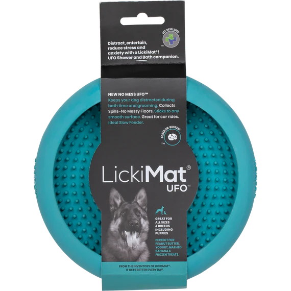 This is the LickiMat UFO shower and bath companion. Distract, entertain, reduce stress and anxiety with the UFO LickiMat. The suction cups on the bottom make it perfect for bathing or grooming. It is a favourite for travel. Great for all sizes & breeds including puppies. Perfect for peanut butter, yoghurt, mashed banana and frozen treats.