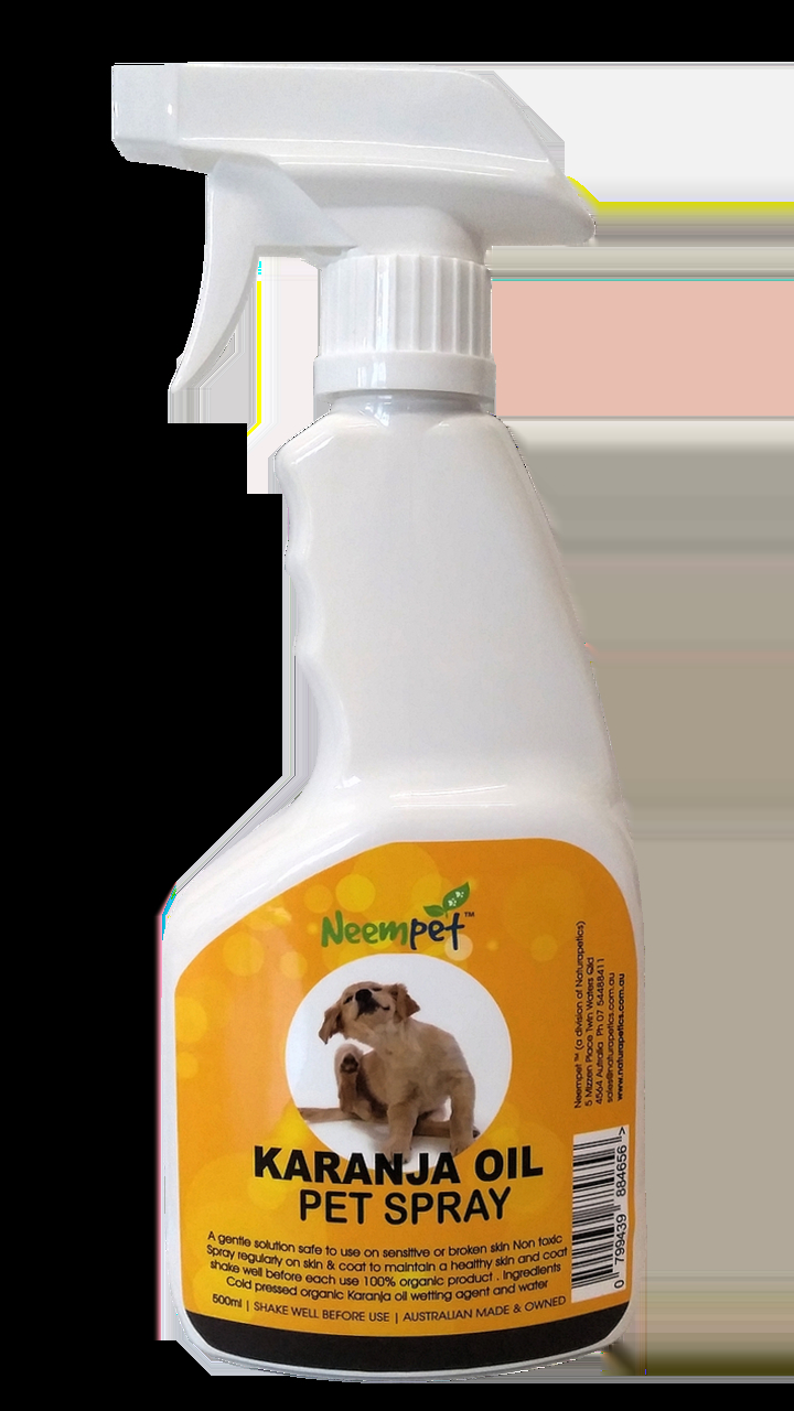 Neempet 500ml Karana Oil Pet Spray is an excellent option for natural pet care! Karanja oil has many well known benefits, including wound healing, soothing insect bites, hot spots, itchy inflamed skin and neutralizing psoriasis & eczema. Karanja oil is also amazing for coat care, regenerating brittle and damaged hair plus giving a beautiful shine. Apply spray to your pets coat in between washes or 1-3 times a week and brush through. This product is non greasy and made purely of organic karanja oil and filtered water.