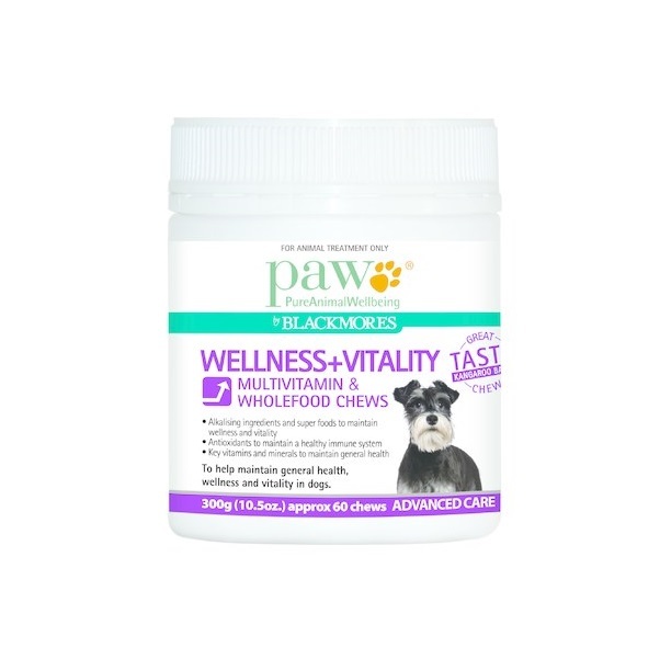 This is a 300g (60 chews) of PAW Wellness + Vitality Multivitamin & Wholefood Chews. This tasty Kangaroo based chew is packed with goodness for overall wellness and health of your dog when given daily. Contains Antioxidants to maintain a healthy immune system. Alkalising organic ingredients and super foods to maintain wellness and vitality. Key vitamins and minerals to help your canine maintain general health.