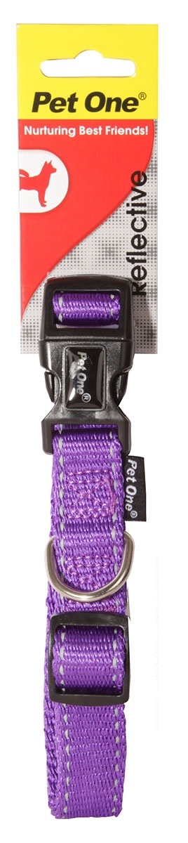 This is the 17-26cm x 10mm Reflective Adjustable Nylon Dog Collar in Purple by Pet One. This dog collar is easily adjusted and is perfect for those dogs who are still growing. The reflective finish will ensure your pet is easily seen. Suitable for use with Pet One reflective dog harness and dog leads.