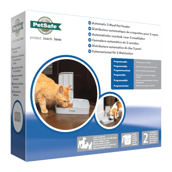 The PetSafe 2 Meal Pet Feeder is best suited for small to medium breed dogs and cats. Each food compartment will hold up to 355 ml of dry food. With the dial timer, set the meal times at 30 minute intervals. It allows you to schedule meals up to 24 hours in advance. The food trays in the feeder are dishwasher safe.