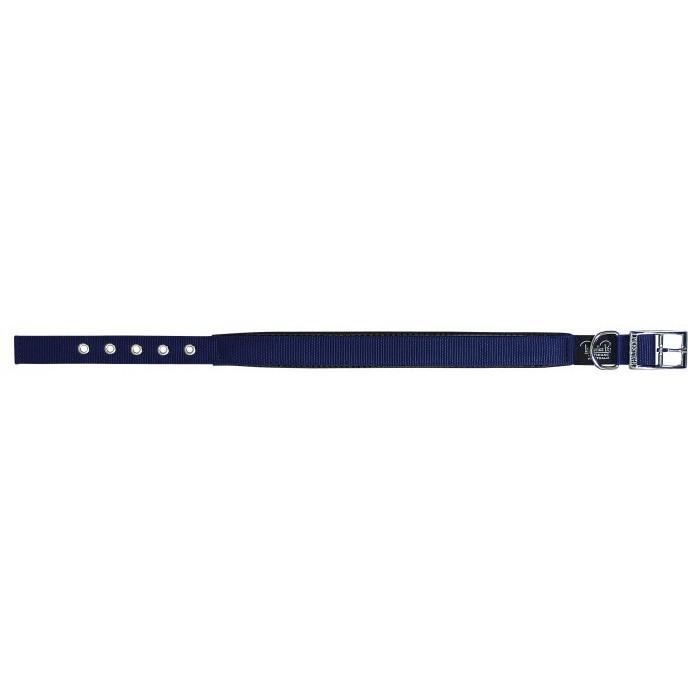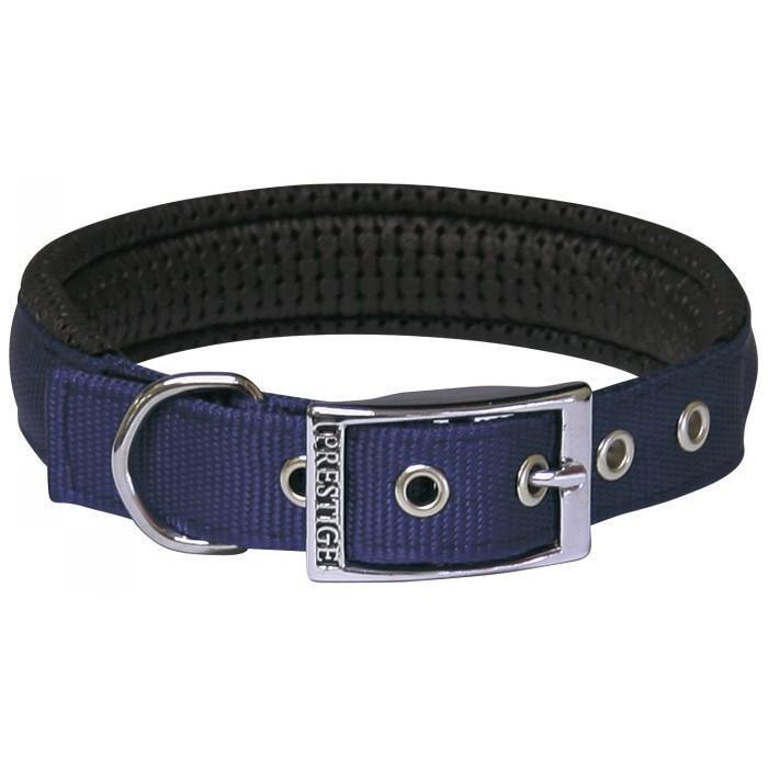 This is a 19mm x 51cm Navy Blue Prestige Pet Soft Padded Nylon dog collar. The foam padding gives your dog extra comfort when walking and when wearing for everyday use. It is made of a durable nylon with chrome plated buckles for strength. The buckle holes are reinforced with metal caps to fight off wear and tear. The Prestige Pet Collars size measurements are from the buckle to the middle hole.