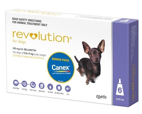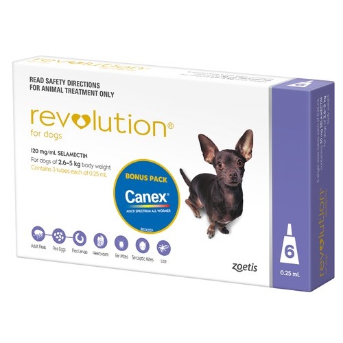 This is a 6 months supply of Revolution for dogs 2.6-5 kgs Flea and Heartworm Control Treatment. This 6 pack of Revolution for dogs 2.6-5 kgs Flea and Heartworm Control Treatment comes in a Purple pack. We make it easy to buy Revolution for dogs 2.6-5 kgs Flea and Heartworm Control Treatment for a cheap price.