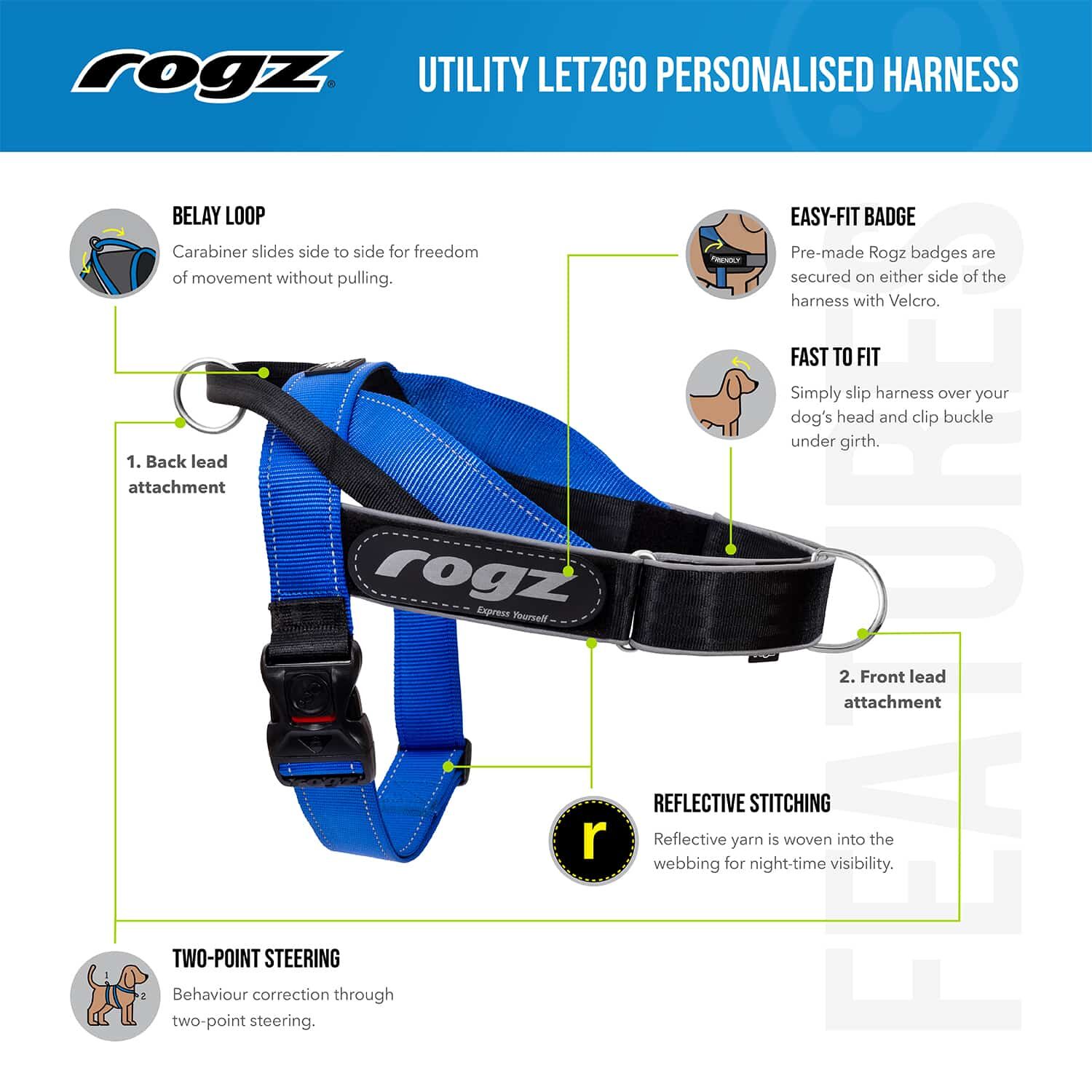 - Customisable Badges: Express your dog's unique personality with pre-made Rogz badges that attach easily to either side of the harness via velcro.