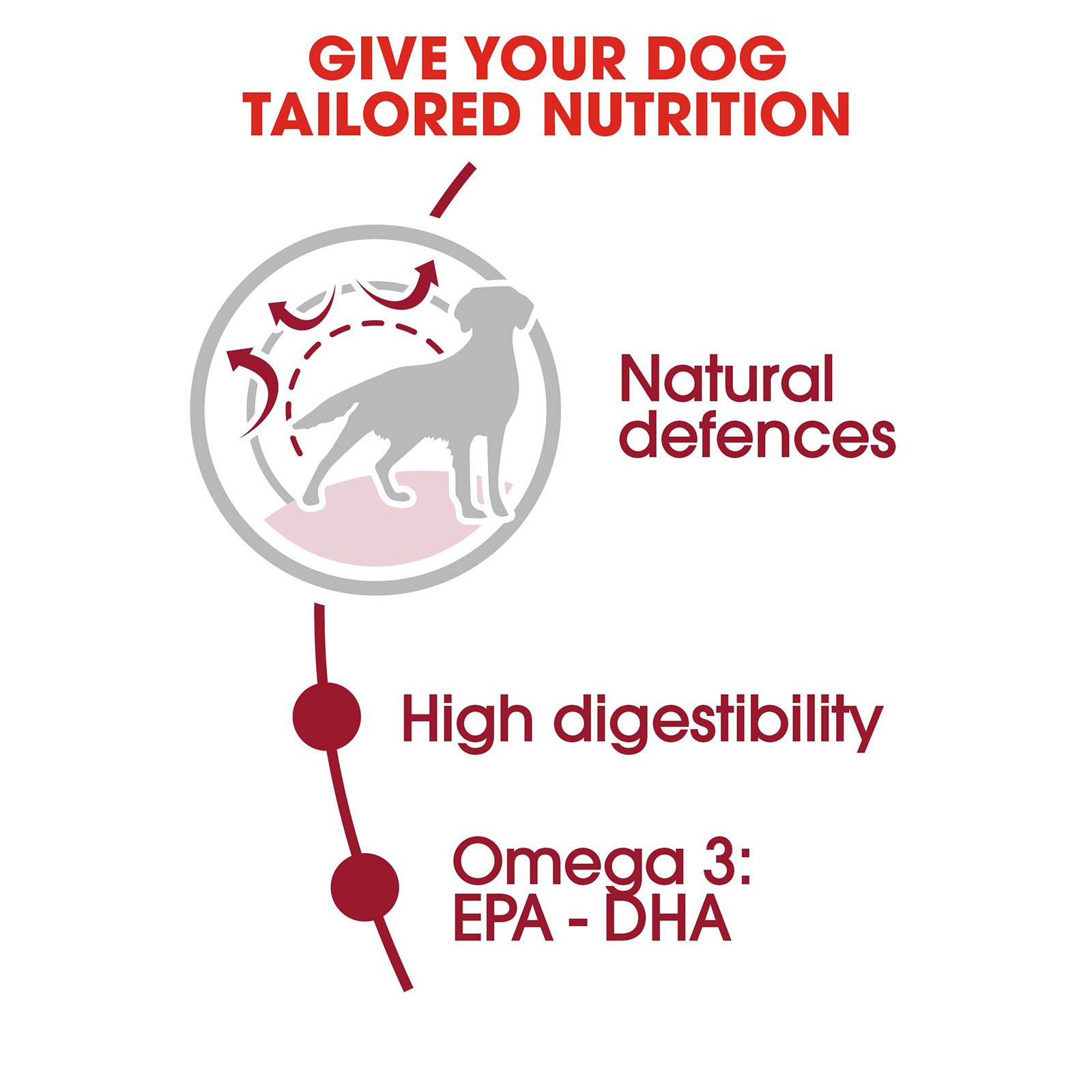 The Royal Canin Medium Adult Premium Dry Dog Food is suitable for medium breed dogs between 11 and 25 kgs, between the age of 12 months and 7 years old. This formula helps support your dog’s natural defences, thanks particularly to an antioxidant complex and manno-oligo-saccharides. It also assists in optimal digestibility thanks to an exclusive formula including very high quality protein and a balanced supply of dietary fibre, and is enriched with Omega 3 fatty acids (EPA-DHA) to help maintain healthy skin.
