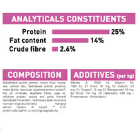 COMPOSITION: dehydrated poultry protein, maize flour, maize, rice, animal fats, hydrolysed animal proteins, maize gluten, beet pulp, vegetable protein isolate*, fish oil, minerals, vegetable fibres, soya oil, cellulose powder, yeasts and parts thereof, hydrolyzed fish protein , hydrolysed yeast (source of manno-oligo-saccharides), marigold extract (source of lutein). ADDITIVES: (per kg): Nutritional additives: Vitamin A: 15500 IU, Vitamin D3: 1000 IU, E1 (Iron): 39 mg, E2 (Iodine): 3.9 mg, E4 (Copper): 12 mg, E5 (Manganese): 50 mg, E6 (Zinc): 134 mg, E8 (Selenium): 0.08 mg - Preservatives - Antioxidants. ANALYTICAL CONSTITUENTS: Protein: 25.0% - Fat content: 14.0% - Crude ash: 6.3% - Crude fibres: 2.6%..