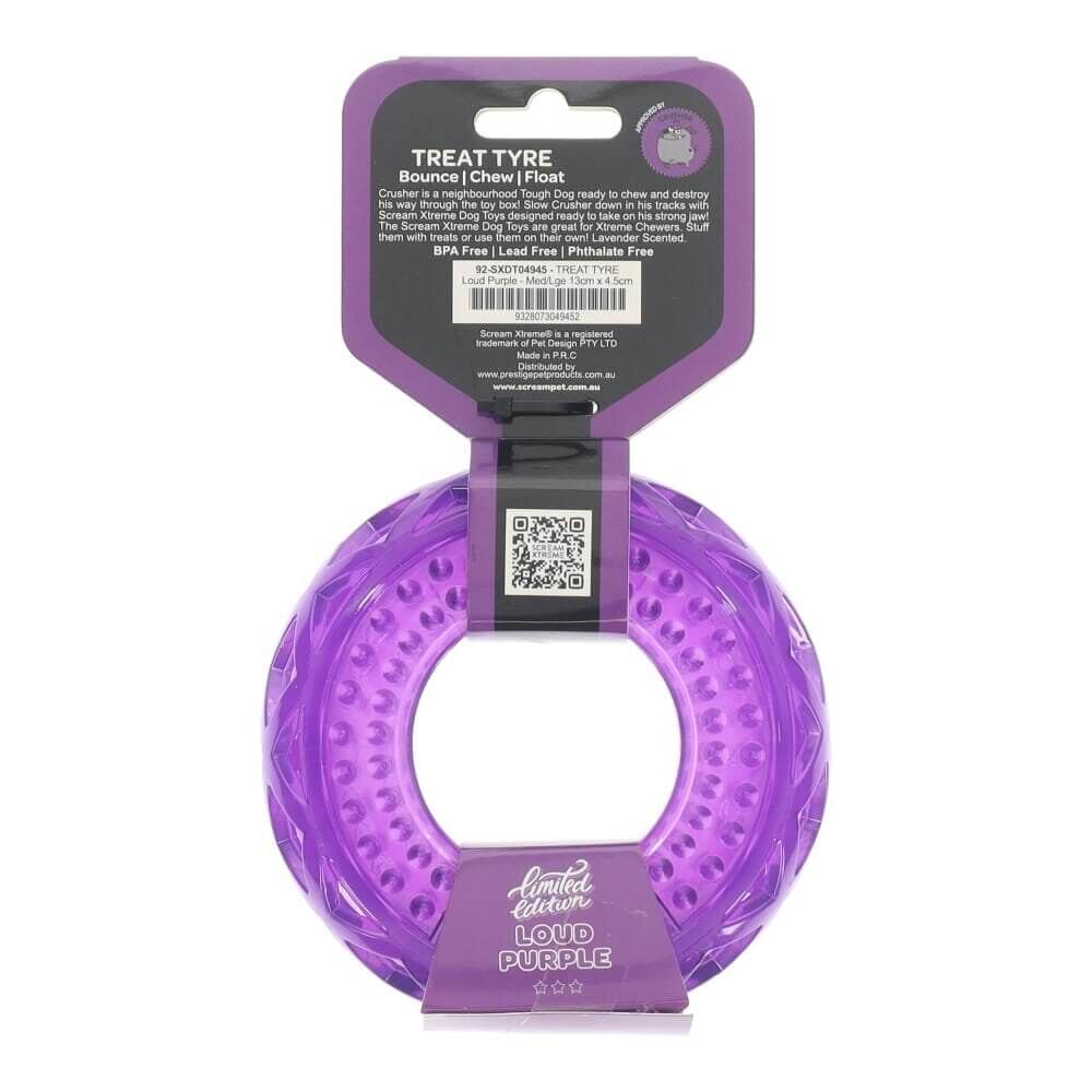 This is a Scream Xtreme Treat Tyre Medium/Large in Loud Purple. The Scream Xtreme Treat Tyre in Medium/Large Loud Purple is a tough, long-lasting chew toy built for extreme chewers. Made from Thermoplastic Rubber (TPR), it's lightweight, weather resistant, and virtually indestructible. Use it as is or fill the inside with paste for an extra challenge. It also floats, making it great for beach and pool play. Lavender scented.