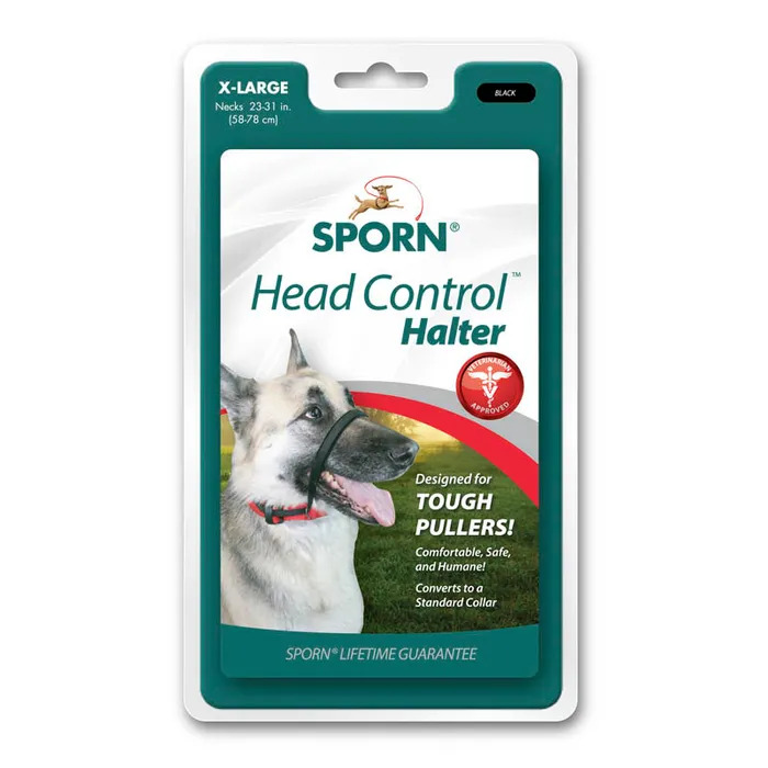 This is the Sporn Head Halter for walking your dog. This head halter will control your dog from the rear. The strap that goes around your dogs muzzle is padded to make it as comfortable as possible. It can be converted to a standard collar if pull control is not needed, such as when dog training.