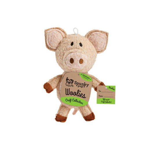 This is a Woolies Mini Pig Plush Dog Toy by Spunky Pup. Snuggly-soft squeaky plush toys made from durable, double-stitched Bali Wool.