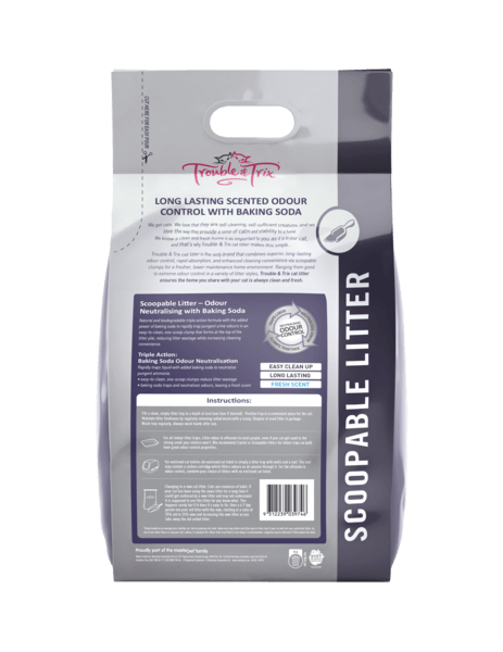 Trouble and Trix Odour Neutralising Clumping Litter Fresh Scent 7L is a highly effective clumping litter that keeps your cat’s tray clean and fresh with minimal effort. It forms strong clumps that are simple to remove, reducing waste and helping maintain a dry and tidy litter box. The light fresh scent works to neutralise unwanted smells, making it ideal for indoor cats and busy households.