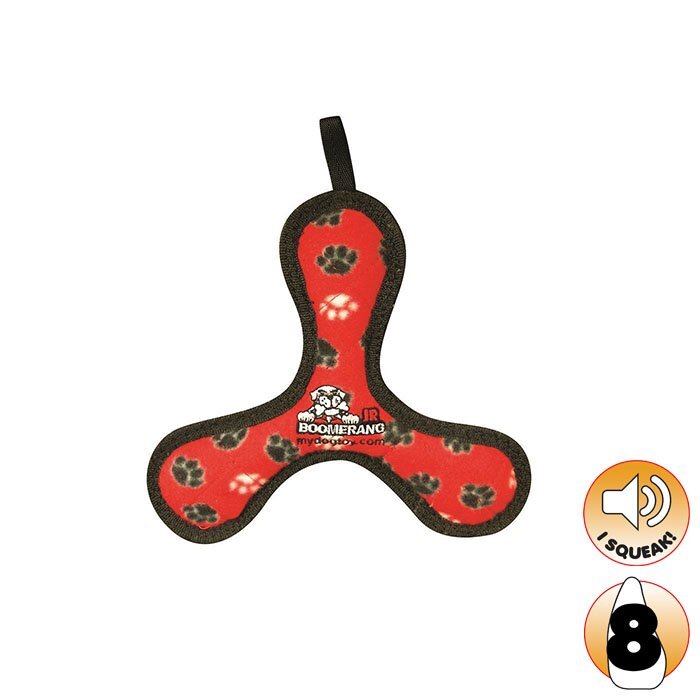 This Red Paws Tuffy Junior Bowmerang toy is soft and strong! Having 7 layers of material and being sewn multiple times, this tough soft dogs toy ranks a 8 on the tuffscale. Containing one squeaker, this toy is suitable for small to medium dogs and is great for interactive play!