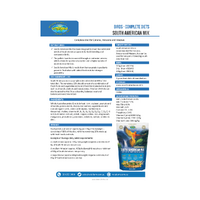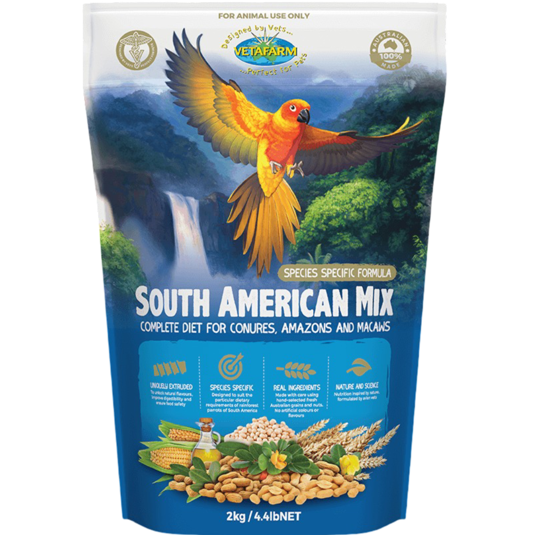 This is a 2kg Vetafarm South American Mix pellet diet for parrots. Vetafarm South American Mix is a complete and balanced daily food specifically formulated for South American parrot species. Developed by avian veterinarians, it provides essential vitamins, minerals and amino acids to support optimal health, feather condition and vitality. The mix is extruded for improved digestibility, safety and nutrient absorption, while maintaining excellent palatability.