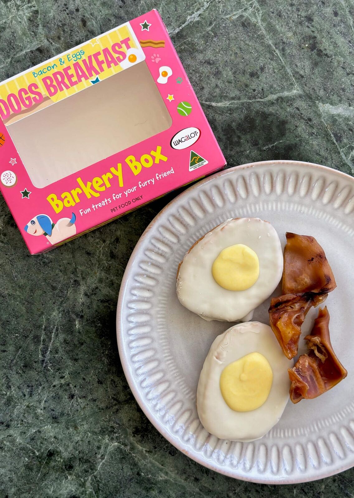 This is a playful dog breakfast treat box by Wagalot. Filled with dog-friendly breakfast-inspired bites like eggs and bacon treats, this box makes morning snack time extra fun for your furry friend.