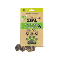 This is a 85g pack of Lamb Puffs from the ZEAL Free Range Naturals dog treat line. They are made with 100% New Zealand Lamb. They are ethically sourced and grain & gluten free. ZEAL lamb puffs make a great treat for your dog to chew on and enjoy.